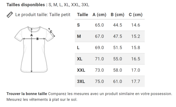 | Tailles | S, M, L, XL, XXL, 3XL |