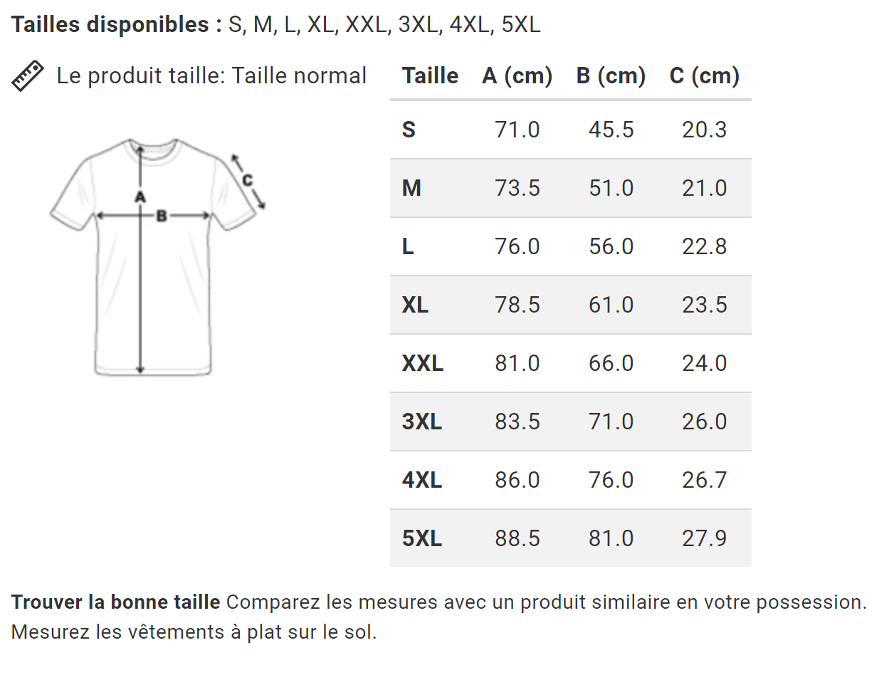 | Tailles | S, M, L, XL, XXL, 3XL, 4XL, 5XL |